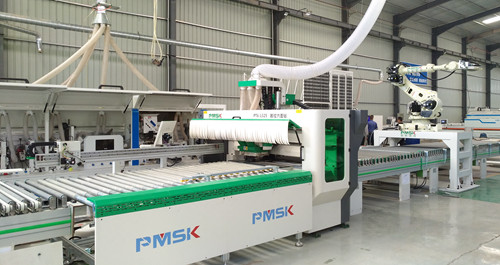 早期的五面鉆,國外的以德國及意大利的PTP五面排鉆加工中心為代表,國內(nèi)很多的大型家具企業(yè)采用的是大板套裁CNC以及PTP五面排鉆加工中心相搭配,來應(yīng)對定制化板式家具的打孔與開槽加工。國內(nèi)的中大型板式家具生產(chǎn)設(shè)備廠家,前期也是以板式家具開料機(jī)、經(jīng)濟(jì)型的數(shù)控側(cè)孔機(jī)、中高端PTP五面排鉆加工中心為主。但是PTP五面鉆,操作相對較為繁瑣,體現(xiàn)在工作臺面為人工移動(dòng)的條形吸附臺面,大板與小板的生產(chǎn)加工需要手工調(diào)整吸附臺面,而且大板與小板尺寸多樣,調(diào)整頻繁。大板加工上料及下料作業(yè)較為繁重,有的板件需要底面加工的人工翻板加工。